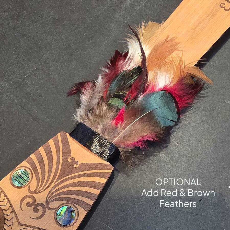 A beautifully designed Maori Taiaha is our alternative to a 21st key or the Taiaha can be used for any special occasion. Engraved to mimic the traditional Maori Taiaha, its neck is also adorned with feathers and its eyes are inlaid with Paua. The Taiaha are made from a native Heart Rimu veneer with a natural plywood base.
